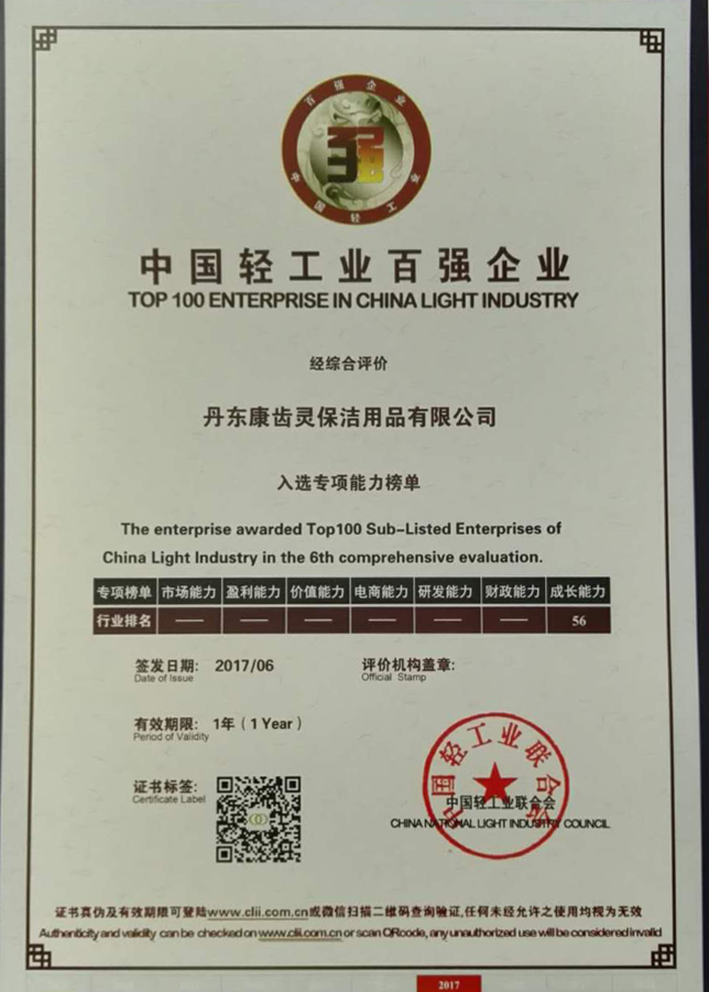 恭喜丹東欣時(shí)代生物醫(yī)藥科技有限公司(原丹東康齒靈保潔用品有限公司)榮獲2017年度中國輕工業(yè)百強(qiáng)企業(yè)。